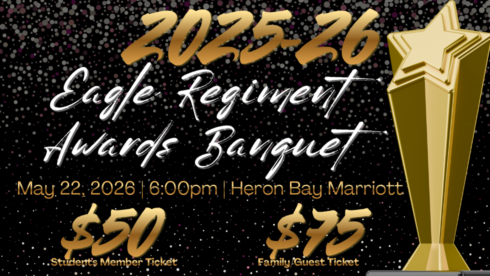 The Eagle Regiment will hold their annual awards banquet on Friday, May 22 at the Heron Bay Marriott. This is open to all 2025/26 members of the Marching Band, Winter Guard, Indoor Percussion as well as students in the band classes, and their parents. Everyone attending will need to purchase a ticket. $50 for Eagle Regiment Student Members and $75 for friends and family members. Ticket sales close 5/10/2026 at 11:50 pm. For more information and buying tickets go to: https://www.stonemandouglasband.com/events/2025-26-eagle-regiment-awards-banquet